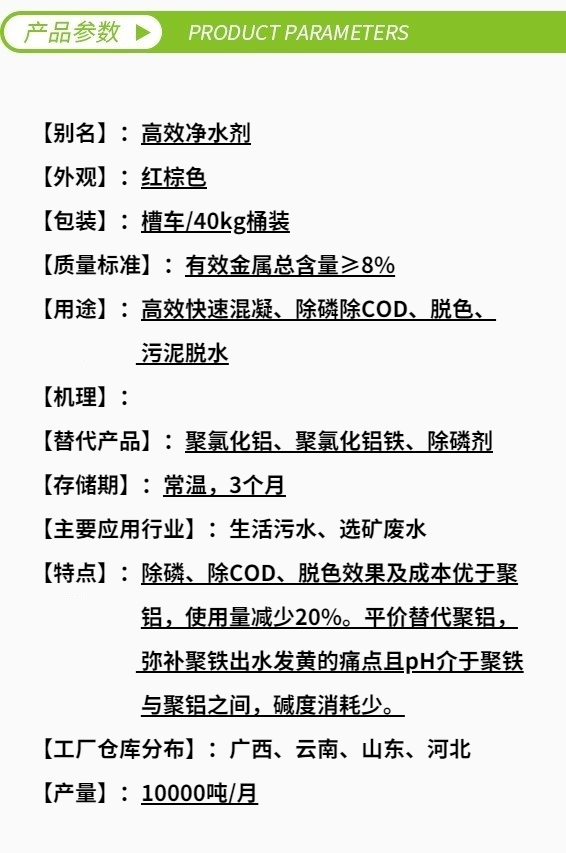 脫色佳:鐵殘留量少,出水色度好,可廣泛取代聚合氯化鋁應用于廢水處理;